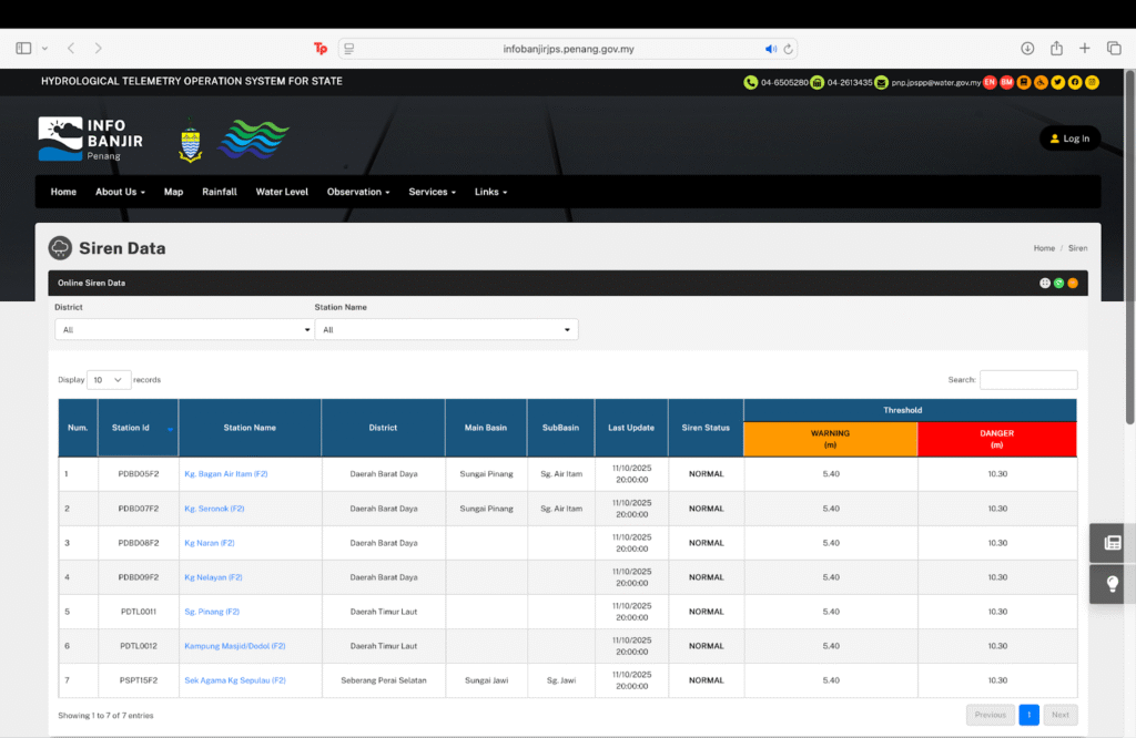 Figure 3. Screenshot of Infobanjir, showing Penang’s siren data as of 11.10.2025 (Source)