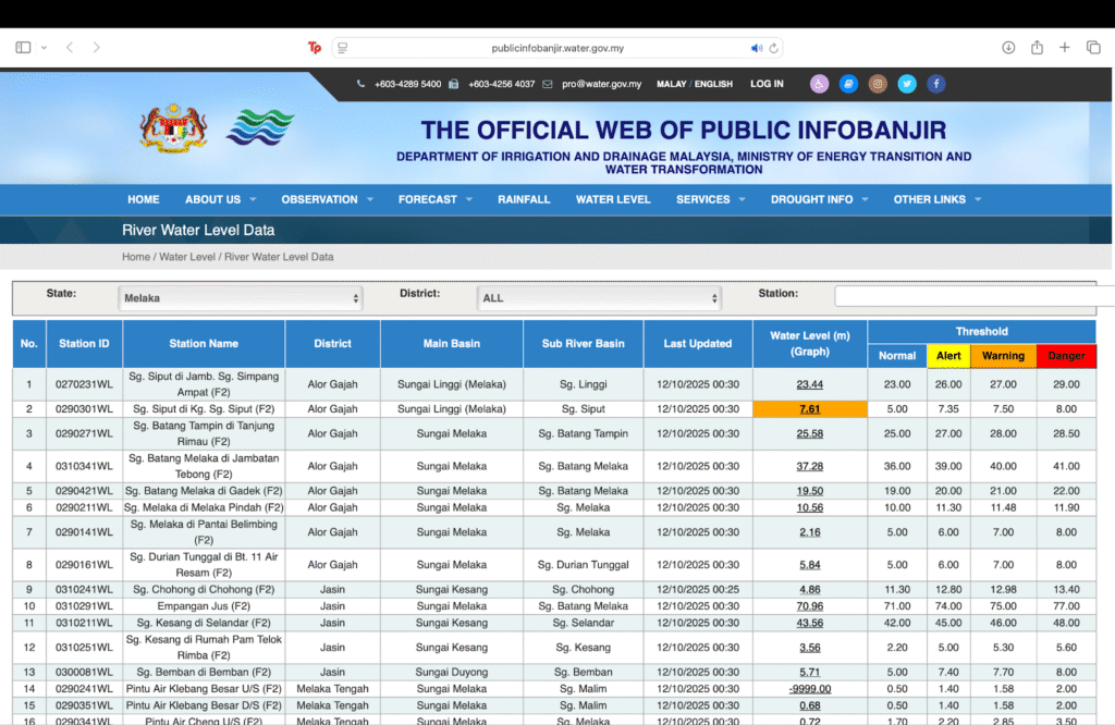 Figure 1. Screenshot of Infobanjir, showing Melaka’s River Water Level Data as of 11.10.2025 (Source)